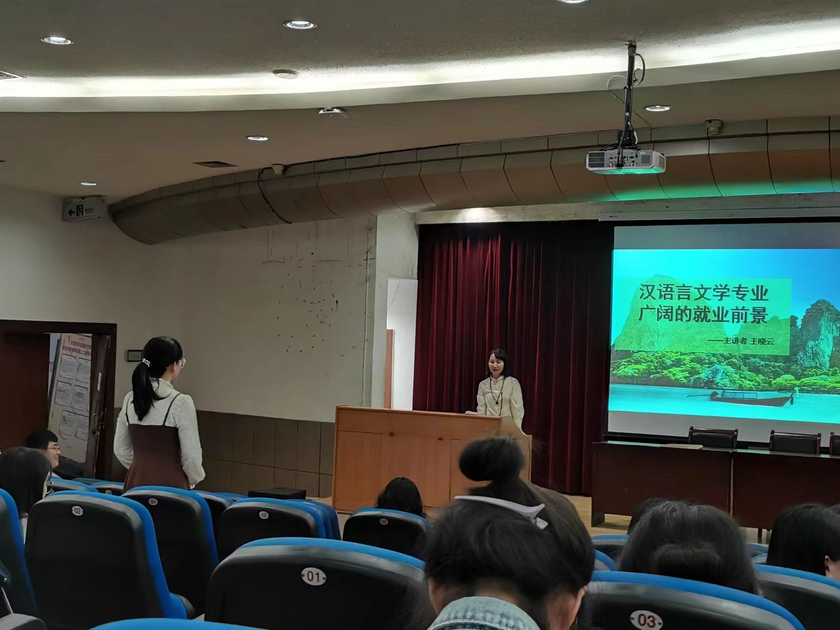 首先,王晓云从语言学角度切入,谈了汉语言文学专业的重要性,鼓励大家将兴趣和专业结合起来考虑将来的职业选择。同时,她结合自身的从业经历、经验等,为同学们求职预备期的迷茫修桥铺路。讲座中,她告诉同学们从基层做起,在职业发展中多汲取经验,从而培养坚韧不拔的精神,能把握住各种机遇,勇敢抓住机会,开拓创新,从一片高地到多片高地,实现爆发力的突破。她也希望同学们无论何时何地都能保持良好的心态,珍爱生命,快乐生活。