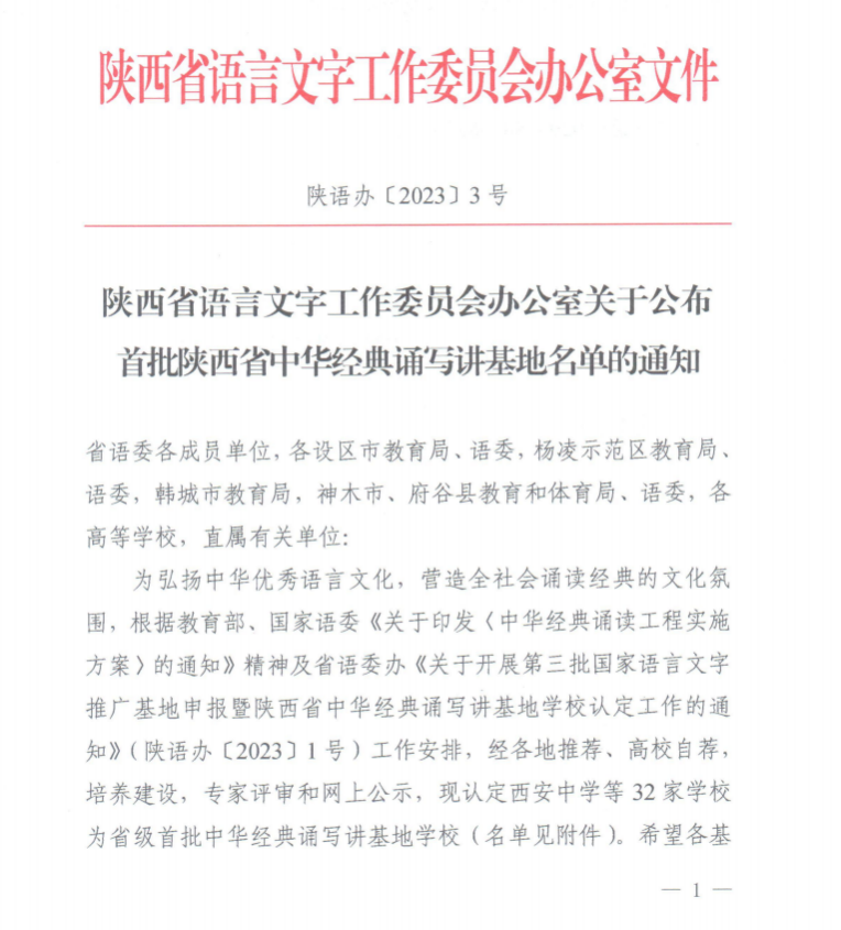 近日,陕西语委办下发文件《陕西语言文字工作委员会办公室关于公布首批陕西省中华经典诵写讲基地名单的通知》(陕语办[2023]3号),由suncitygroup太阳集团负责申报并建设的“suncitygroup太阳集团官方网站中华经典诵写讲基地”,经过1年的建设,顺利通过评审,获批为陕西省首批“中华经典诵写讲基地”。