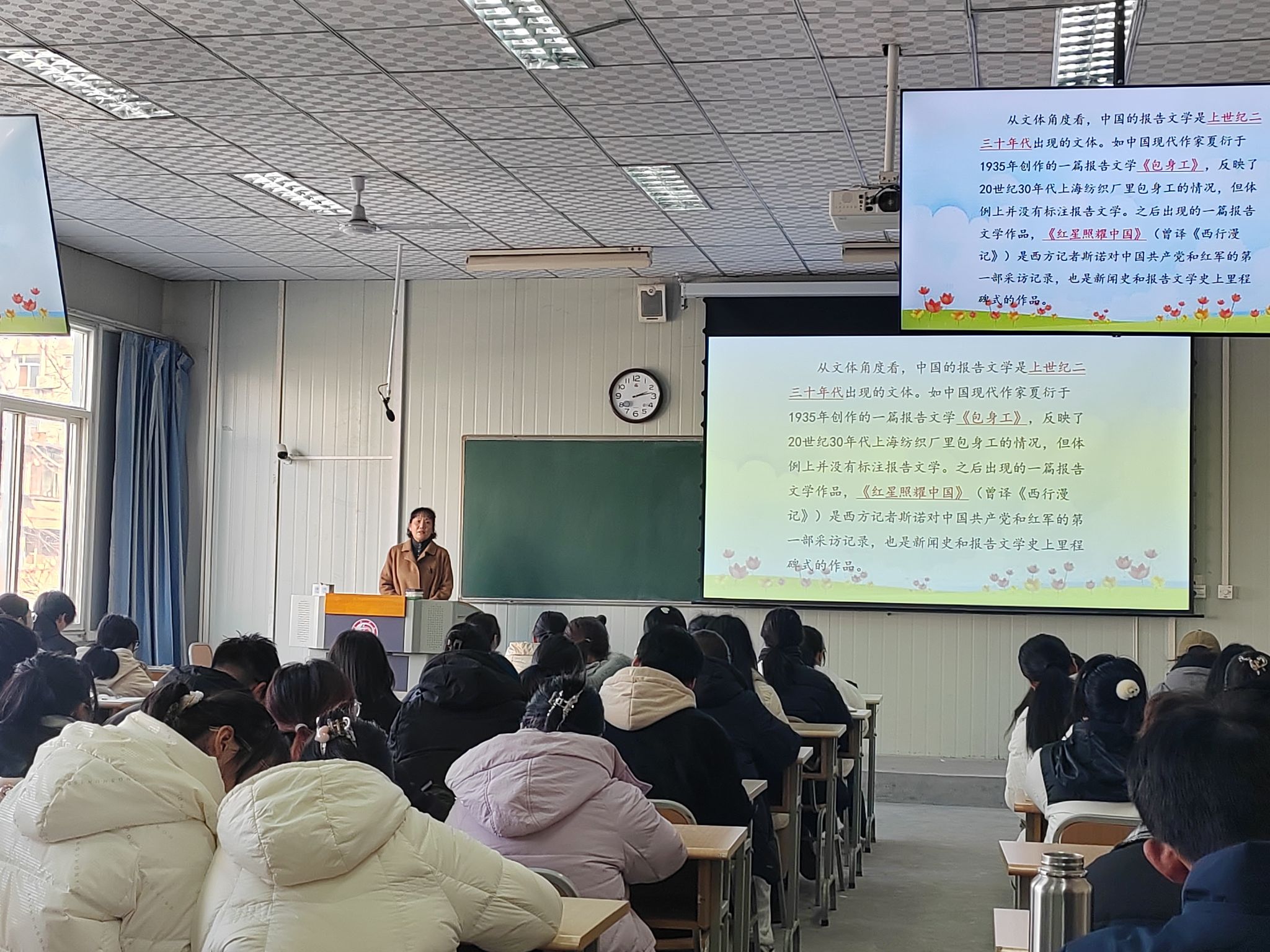 应suncitygroup太阳集团邀请,作家李春芝于1月4日下午在江南1026为汉语言文学2023级1、2班员工讲授报告文学的写作。