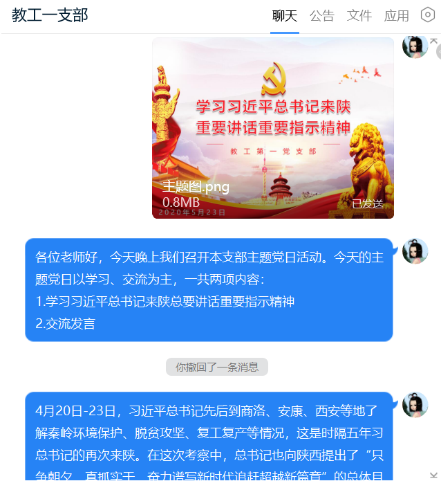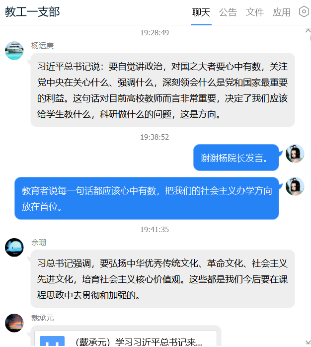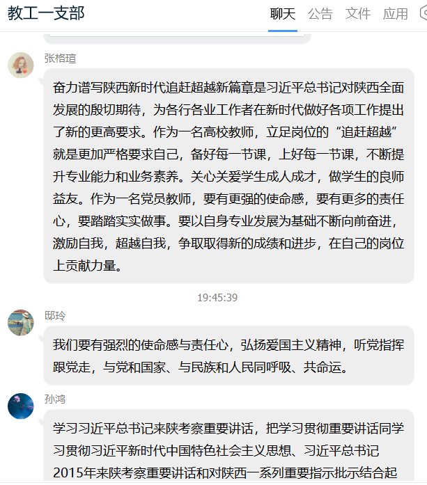 导航痕迹 首页 > 党建群团 > 正文 党建双创 党风廉政专栏 教工之家 团总支 员工分会 suncitygroup太阳集团教工第一党支部开展“学习习近平总书记来陕重要讲话重要指示精神”线上主题党日活动 发布人: 发布日期:2020年05月25日 阅读次数: 5月23日,suncitygroup太阳集团教工一支部依托支部QQ群开展了“学习习近平总书记来陕重要讲话重要指示精神”线上主题党日活动。活动由教工一支部书记李婷主持,本支部全体党员参加学习和讨论。 按照活动流程,首先由支部书记李婷带领大家共同学习习近平总书记来陕重要讲话重要指示精神相关内容,包括省委常委会议要点、习近平在陕西考察专题报道等。 随后,党员们结合学习内容分享了对于党员大局意识、历史意识、角色意识的认识,对“西迁精神”“延安精神”的理解,对教师职业道德、课程思政、教师教学科研方向等问题的思考,也表明了只争朝夕、真抓实干,为坚持社会主义办学方向、做好高校好老师而努力的决心。 在本次主题党日活动过程中,党员们学习认真,发言踊跃,活动气氛十分热烈。 (撰稿/图片提供 李婷 审核/于咏梅 发布/沈菲)