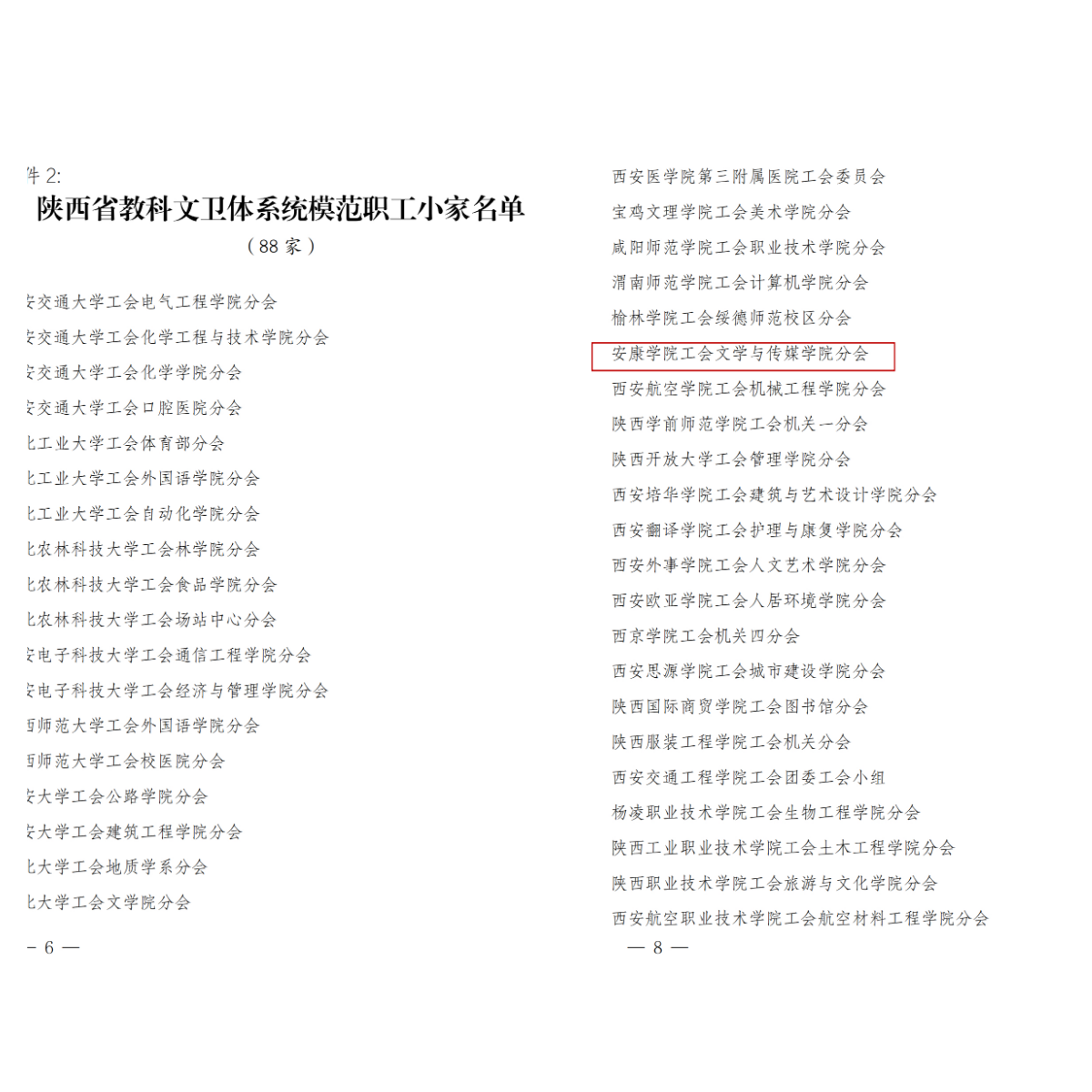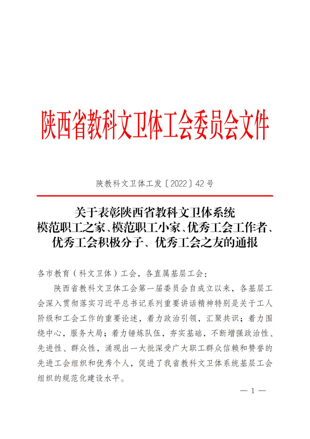 近日,陕西省教科文卫体工会委员会印发《关于表彰陕西省教科文卫体系统模范职工之家、模范职工小家、优秀工会工作者、优秀工会积极分子、优秀工会之友的通报》,工会suncitygroup太阳集团分会被授予陕西省教科文卫体系统模范职工小家称号。
