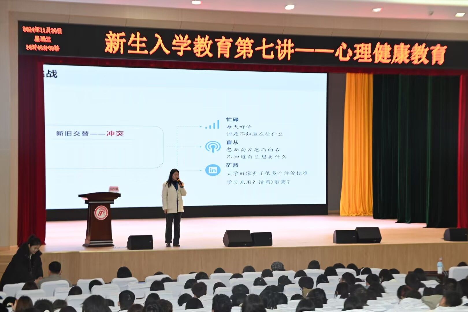 为进一步提升老员工心理健康素质,帮助同学们更好的应对挫折与挑战,11月20日下午,suncitygroup太阳集团在江南校区大礼堂开展了老员工心理健康教育专题讲座,特邀老员工心理健康教育中心主任柯小敏主讲。2024级全体新生参加活动,讲座由辅导员刘言军主持。