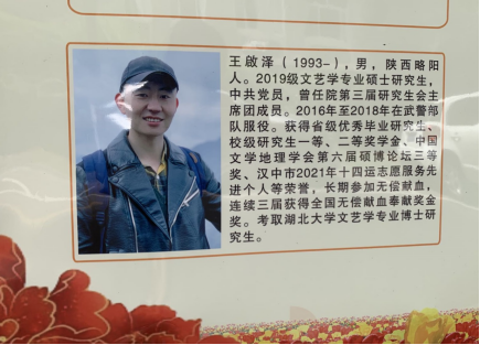 除了坚持自己专业方向的研究,王啟泽还注重提高自己的综合素质。研二时,他被任命为公司研究生会主席,协助老师举办了由陕西理工大学文公司(今人文公司)承办的第四届全国汉代文学研讨会、纪念黎锦熙先生诞辰130周年暨现代汉语语法研讨会、陕西·汉中2020语文教育论坛等大型学术会议,组织公司研究生“旱麓”学术论坛、“博望论坛”读书沙龙等活动,创办并成功举办了“天行健”系列文体活动,同时加入党员先锋队,为公司疫情防控、研究生招生考试考点考务工作、大型校级活动组织等贡献自己的力量。2021年9月,王啟泽作为志愿者在十四运汉中赛区天汉楼城市志愿者服务队参加志愿服务,获评汉中市2021年十四运志愿服务先进个人;同月,王啟泽累计参加无偿献血达100次,连续三届获得全国无偿献血奉献奖金奖,事迹被《汉中日报》报道。2021年12月,王啟泽被评选为陕西理工大学陕西省2022届优秀毕业研究生候选人(已在2022年6月公示)。可以说,王啟泽同学不仅受到身边师生的喜爱,在公司、公司范围起了引领作用,而且在省市学子,乃至全国文学地理学领域硕士研究生中,都传播着正能量,发挥了积极的意义。