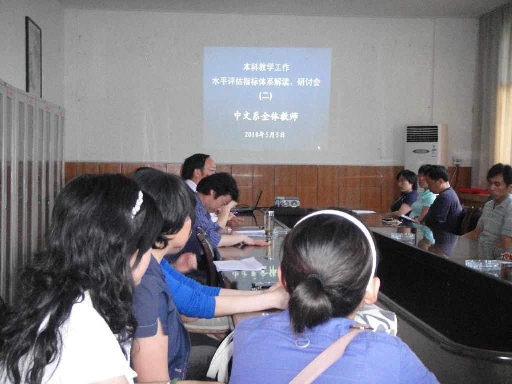 导航痕迹 首页 > 新闻通知 > 公司新闻 > 正文 公司新闻 通知公告 中文系组织全系教师深入学习本科教学工作水平评估指标体系 发布人: 发布日期:2010年05月06日 阅读次数: 为了加深对本科教学水平评估指标体系内涵的理解,人人参与评估,人人重视评估,中文系组织全系教师于2010年5月5日下午在公司大会议室对本科教学工作水平评估指标体系进行了第二次解读、研讨。通过本次解读研讨会,中文系教师对本科教学水平评估体系中的“教学条件与利用”“ 专业建设与教学改革”两方面有了更深入的了解。 本次学习活动由中文系主任戴承元主持。