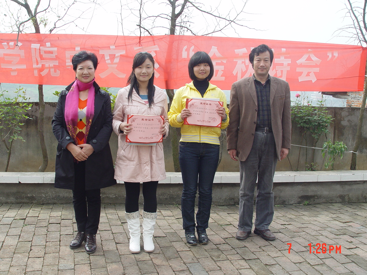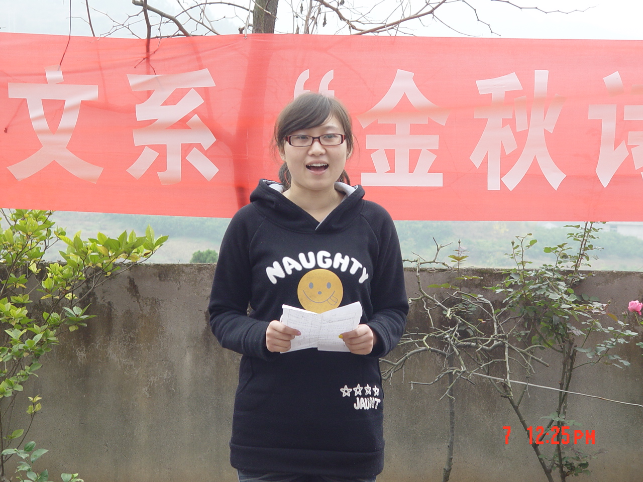 为了增进员工对地方民俗民情的了解,激发他们爱国爱乡的热情,同时提高员工感悟生活、感悟文学、感悟美的能力,中文系于2010年11月7日组织员工在九里湾举办了一场别开生面的“金秋诗歌朗诵会”。