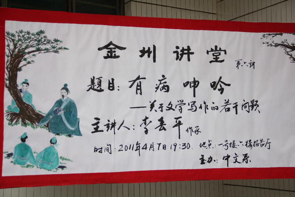 2011年4月7日晚,中文系副教授、当代著名作家李春平应邀做客金州讲堂,在一号教学楼六楼报告厅为广大师生做了题目为《文学:有病呻吟》的专题讲座。
