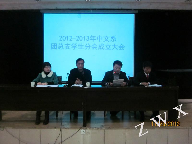 2012年11月23日晚8点,suncitygroup太阳集团官方网站中文系2012-2013学年度团总支员工分会成立大会在一号楼六楼报告厅正式举行。到会的有中文系党总支书记李岩、团总支书记沈菲;2011-2012学年度团总支员工分会主席团及各部部长、2012-2013学年度团总支员工分会主席团、各部部长及全体干事。成立大会在全体到会人员合唱国歌的旋律中拉开序幕。