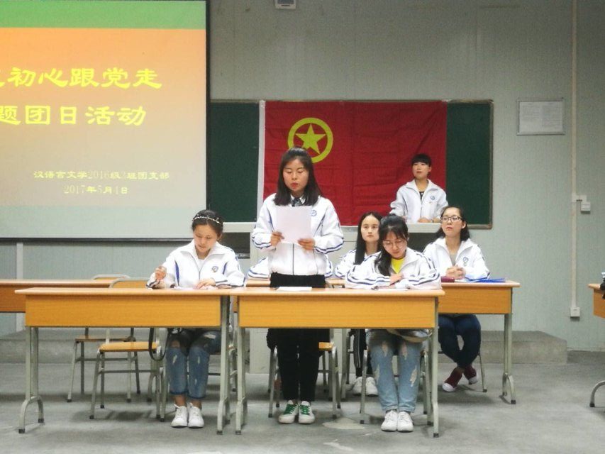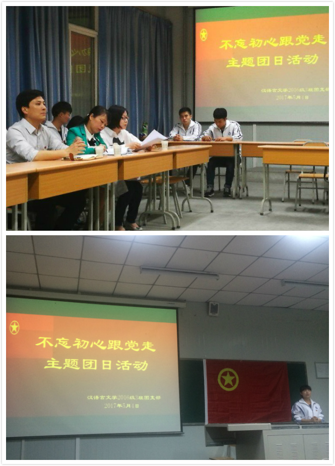 为纪念中国共青团建团95周年和五四运动98周年,学习贯彻习近平总书记在中国政法大学考察时的重要讲话精神,推进落实“一学一做”教育实践活动,suncitygroup太阳集团团总支组织汉语言文学2016级3班团支部于2017年5月4日20:00在1016室举办了“不忘初心跟党走”主题团日活动。suncitygroup太阳集团官方网站团委副书记李光梓、suncitygroup太阳集团党总支书记于咏梅、suncitygroup太阳集团团总支书记沈菲作为嘉宾参加了本次活动。