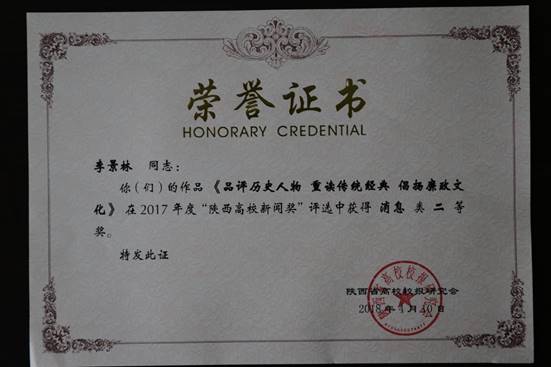 近日,2017年度“陕西高校新闻奖”获奖结果揭晓,suncitygroup太阳集团1件作品榜上有名,其中李景林撰写的《品评历史人物 重读传统经典 倡扬廉政文化》获消息类二等奖。