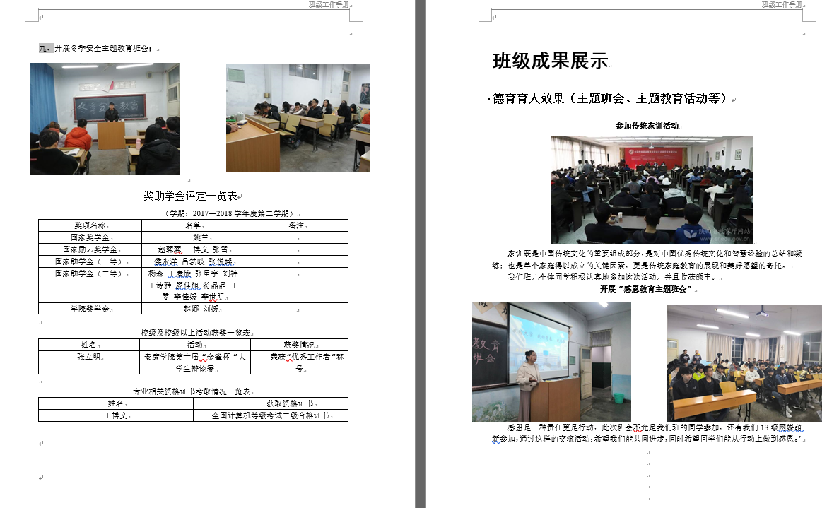 经过员工评选,评委评选,本着公平公正公开的原则,按照员工打分占30%,教师打分占70%的比例,对2016、2017、2018三个年级共计十六个班级近一年来的工作手册进行了考核和打分,同时此项打分将按照一定的比例折算计入文明班级评选得分,作为班级考核材料让文明班级的评选更公平合理。评选中发现,各班工作手册排版美观、布局合理、条理清晰、图文并茂,内容完备,是班级成员一学期成就和班干部一学期工作成果的集中展示,按照班级建设理念与发展规划,也提出了下一学期的工作展望。