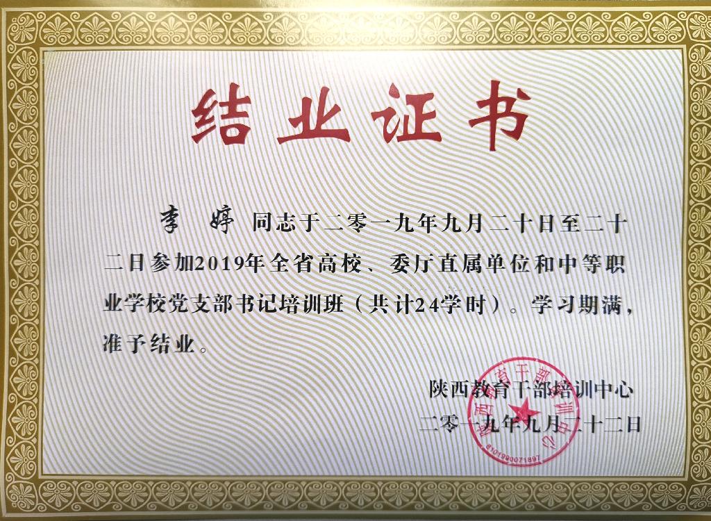 为深入学习贯彻习近平总书记关于“不忘初心、牢记使命”主题教育的重要讲话和指示批示精神,推动第二批“不忘初心,牢记使命”主题教育扎实开展,省委教育工委、省教育厅于9月20-22日在陕西交通职业技术公司举办2019年全省高校、委厅直属单位和中等职业公司党支部书记培训班。公司教师、suncitygroup太阳集团教工一支部书记李婷参加本期培训班,圆满完成三天培训学习。