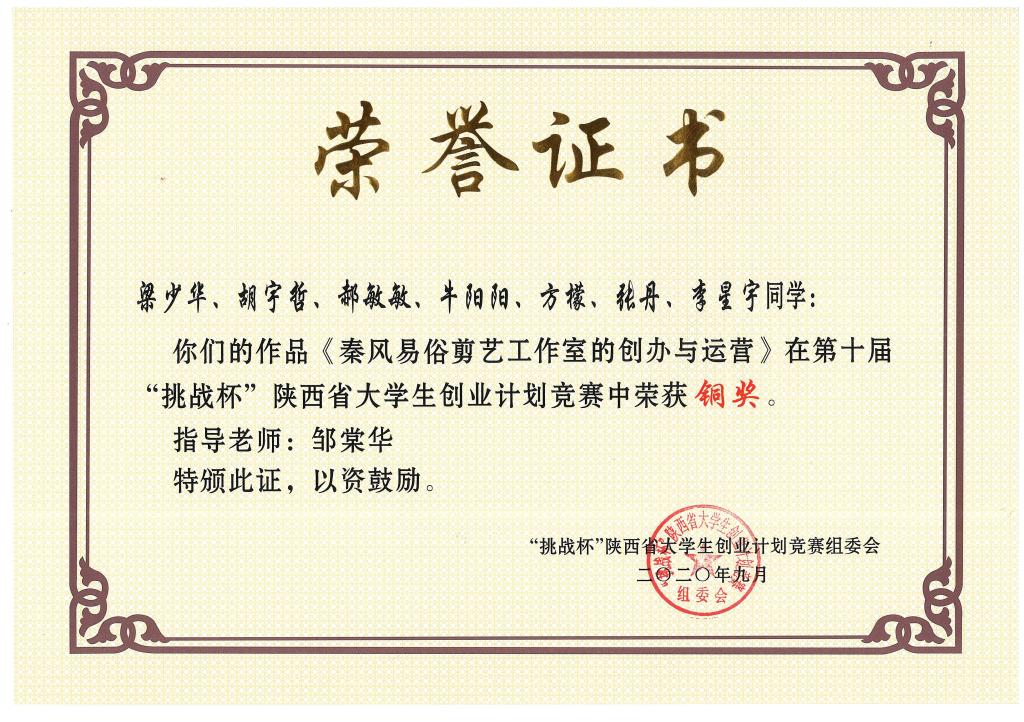 9月11日,大赛圆满落下帷幕,suncitygroup太阳集团官方网站参赛作品获银奖1项、铜奖6项。其中,由suncitygroup太阳集团邹棠华老师指导、2019级秘书学1班梁少华、胡宇哲等同学完成的参赛作品《秦风易俗剪艺工作室的创办与运营》获得铜奖。