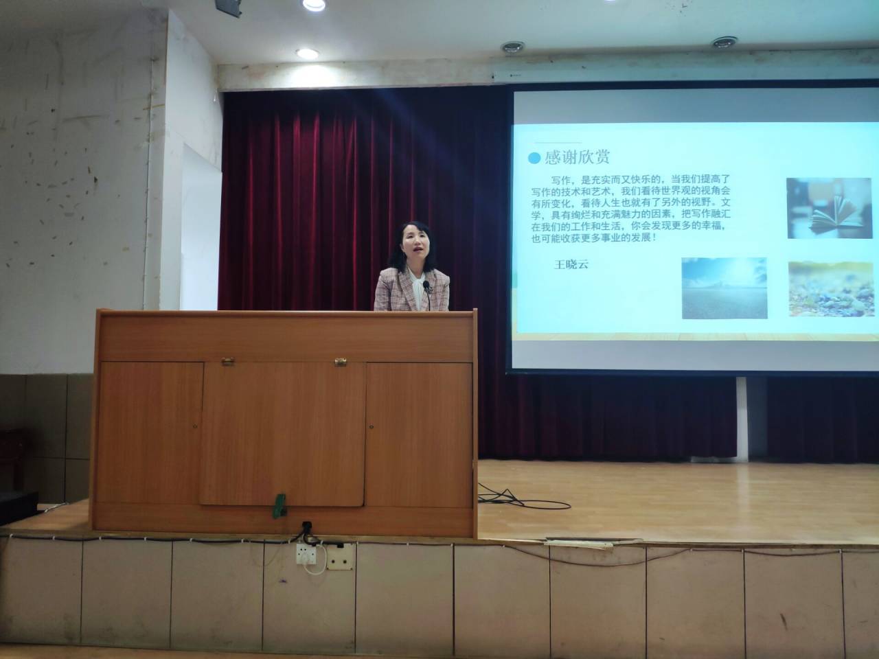 2020年12月8日,晚七点整,著名作家王晓云应suncitygroup太阳集团邀请,在江南1号教学楼报告厅与基础写作任课教师韩文霞一起,为汉语言文学专业2020级员工讲授“小说创作”一课。同学们对王晓云老师的到来表示热烈的欢迎。汉语言文学系主任李婷到场听课。