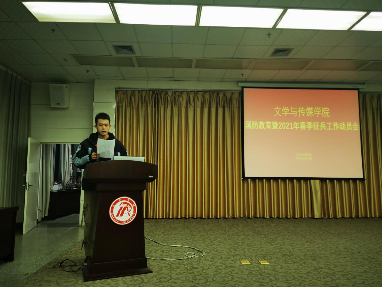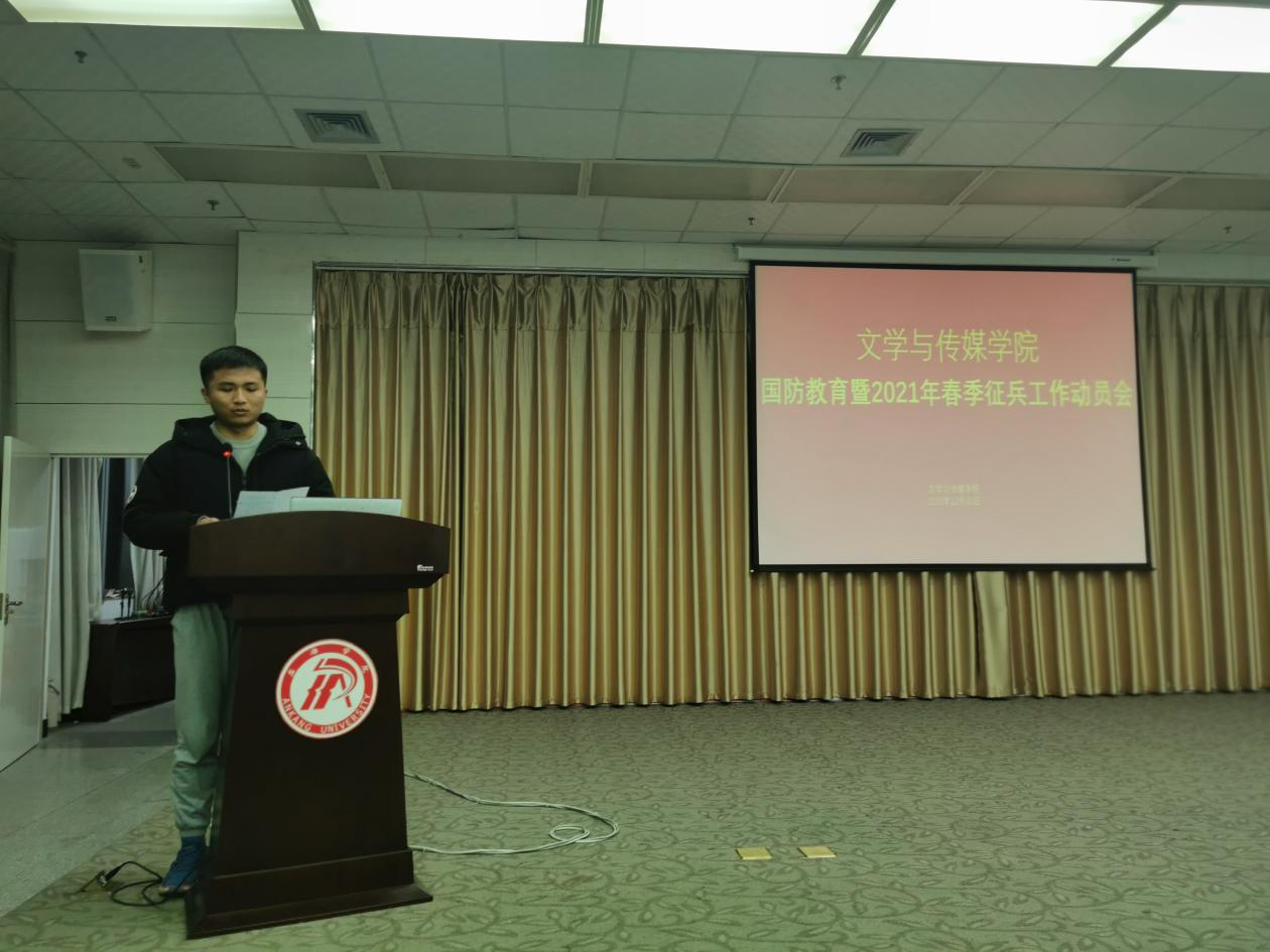 会议伊始,王瑞卫老师从相关法律对军人的优待政策、征兵工作条例、应征入伍体检标准、老员工应征入伍优惠政策、老员工应征入伍流程等六个方面向同学们进行了详细的讲解。他希望广大同学积极响应国家号召,抢抓机遇、迎接挑战,主动投身军营,让人生在实现强军梦中绽放绚丽光彩。