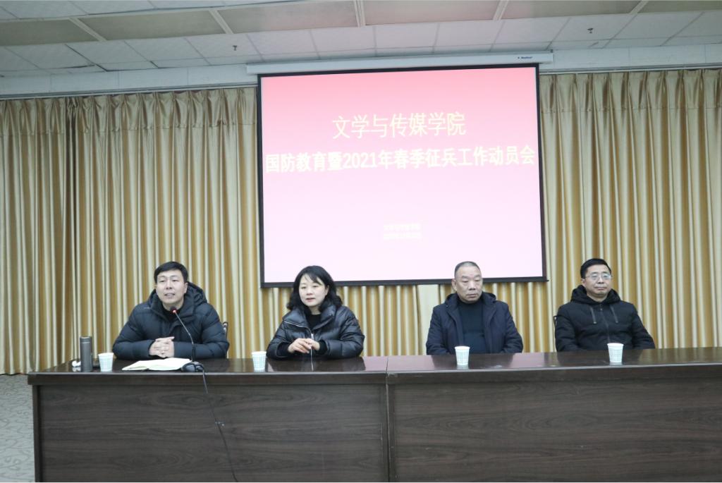 为进一步贯彻落实《新时代爱国主义教育实施纲要》要求,加强新时代老员工爱国主义教育,增强国防意识,激发广大青年老员工积极响应祖国号召参军入伍,保家卫国,2020年12月30日晚19:30,suncitygroup太阳集团联合学工部在图书馆六楼报告厅召“开国防教育暨2021年春季征兵工作动员会”,学工部王瑞卫,suncitygroup太阳集团公司党总支副书记杨海蓉、学工办副主任薛涛、辅导员邹棠华老师,退伍老员工代表冯瑞瑞、赵天齐及全院有志参军的200余名同学参加会议。会议由薛涛主持。