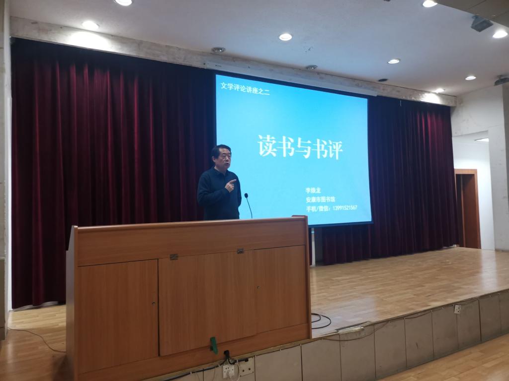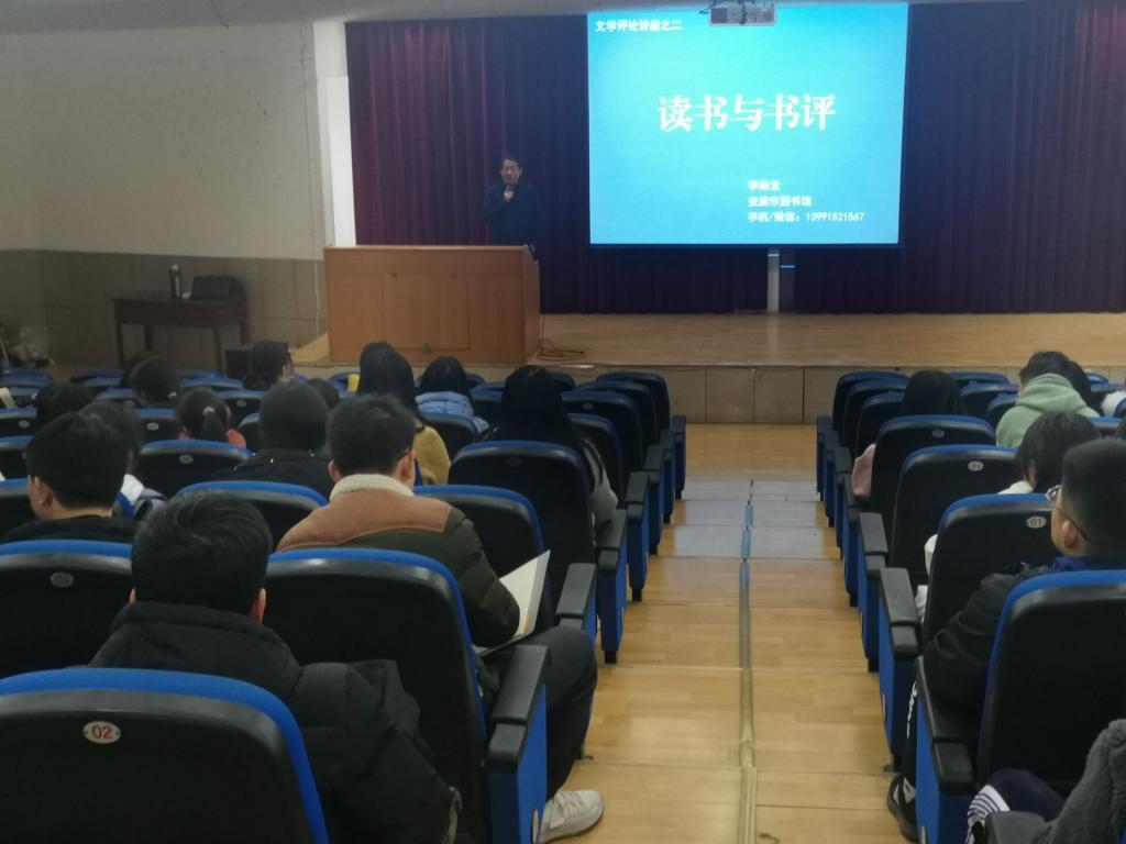 1月4日晚上,安康市图书馆馆长李焕龙应suncitygroup太阳集团邀请,在江南1号楼报告厅,为汉语言文学专业2020级四个班的员工讲授“文学评论的写作”一课,基础写作课教师韩文霞全程参与。