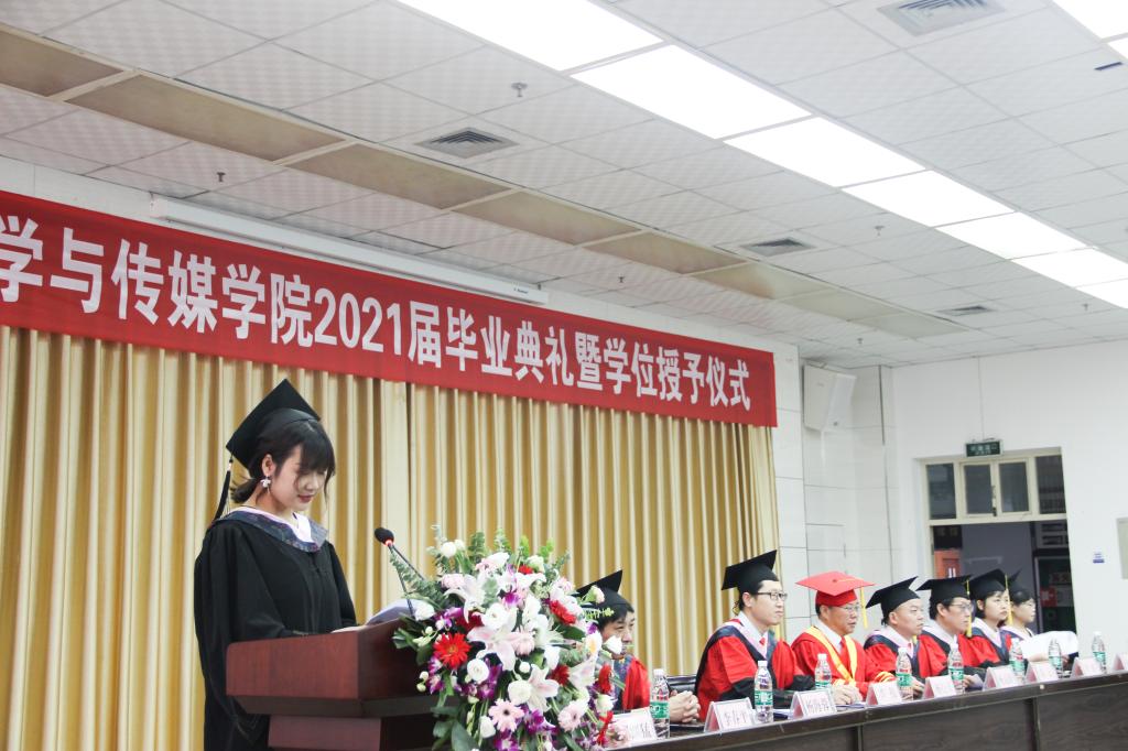 2017级网络与新媒体专业毕业生姚兰作为毕业生代表发言,她谈起自己老员工活学习的点点滴滴,表达了对师长、亲人、同学的感恩之情,表示将带着文传学子自信、向上、奋斗的精神风貌,以实际行动践行“笃学、尚行、砺志、创新”的校训,承载起青年一代的使命担当。