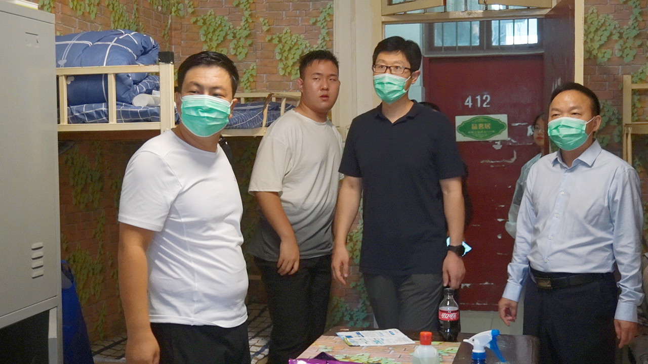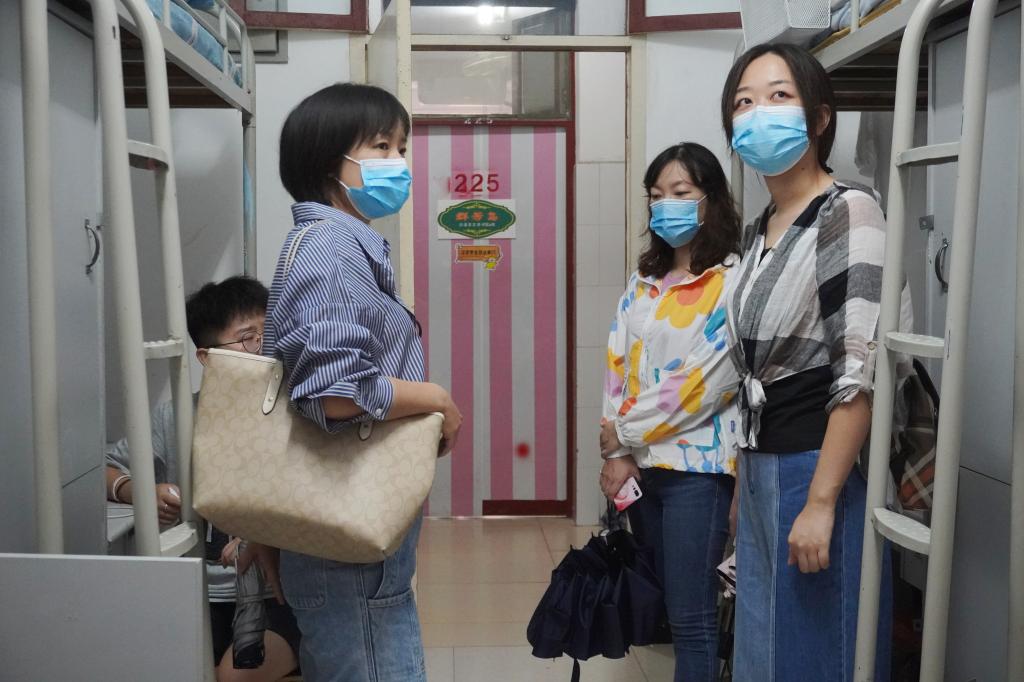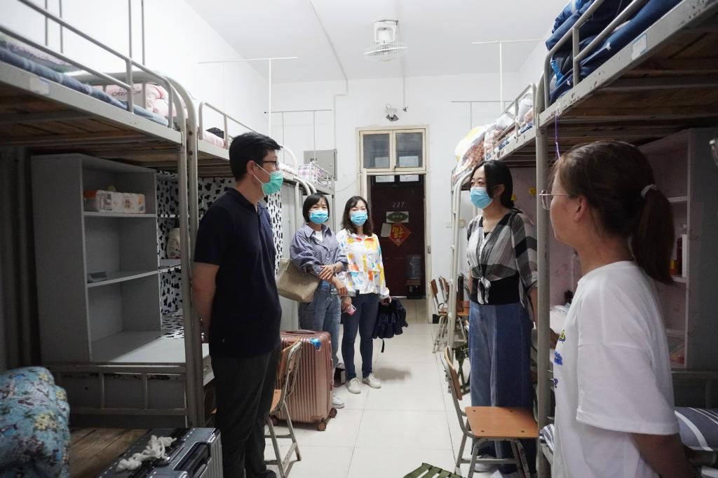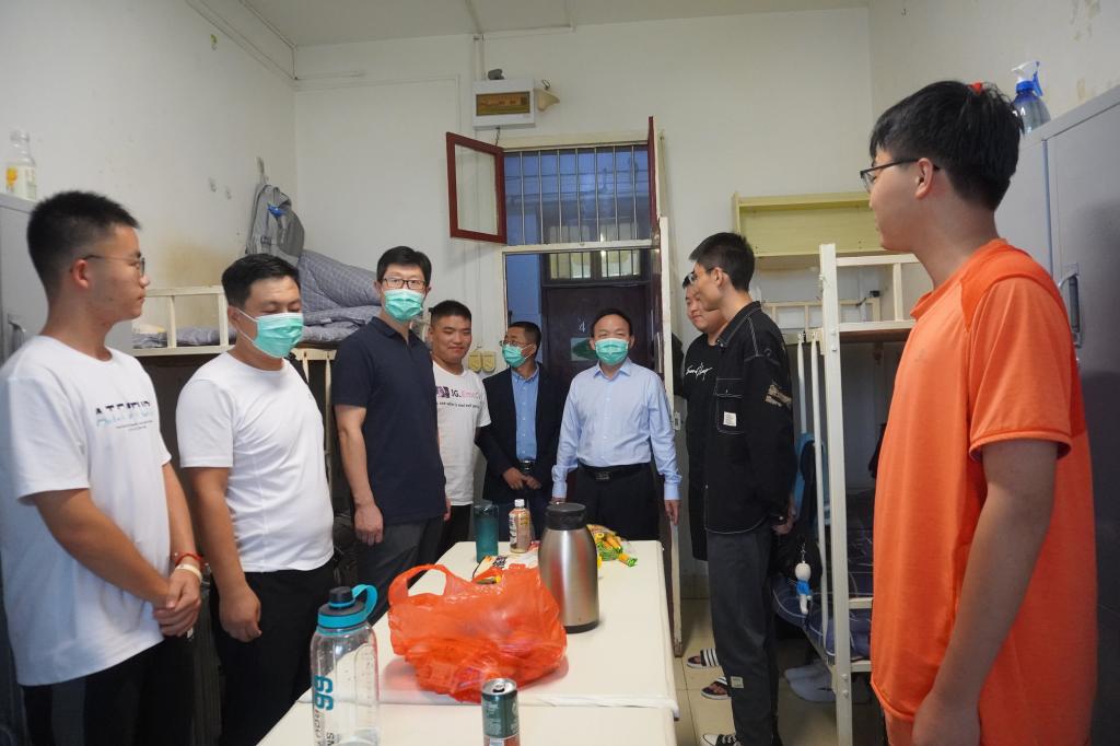2021年8月28日17:00,大雨如注,suncitygroup太阳集团经理杨运庚、党总支书记芦伟、副经理李婷带领辅导员和综合办公室主任前往新生宿舍,看望2021级已报到入住的新同学。