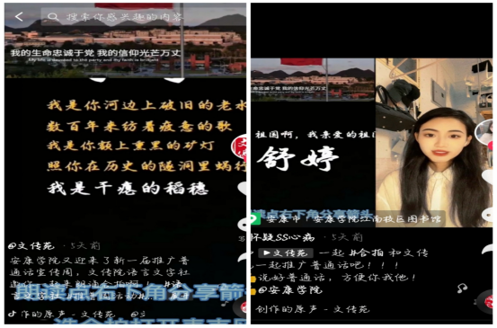 除了一系列线下的推普活动,语言文字社还紧随时代潮流,利用当下流行的抖音合拍功能,进行了普通话的推广。通过剪辑视频发送至suncitygroup太阳集团官方抖音,号召全校师生进行合拍朗诵,达到推广普通话的目的。视频一经发出,就受到了广泛的关注,同学们也积极进行了线上朗诵合拍。