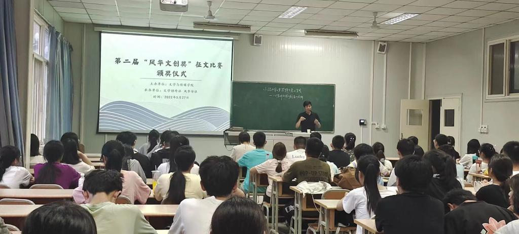 2022年5月27日晚上8点,第二届“风华文创奖”征文比赛颁奖典礼在suncitygroup太阳集团官方网站江南校区1026教室顺利举行。文学创作社指导老师李春平、风华诗社指导老师韩文霞、特邀嘉宾曹刚老师、风华诗社和文学创作社社团成员、网络与新媒体2021级同学及获奖作者代表出席本次活动。