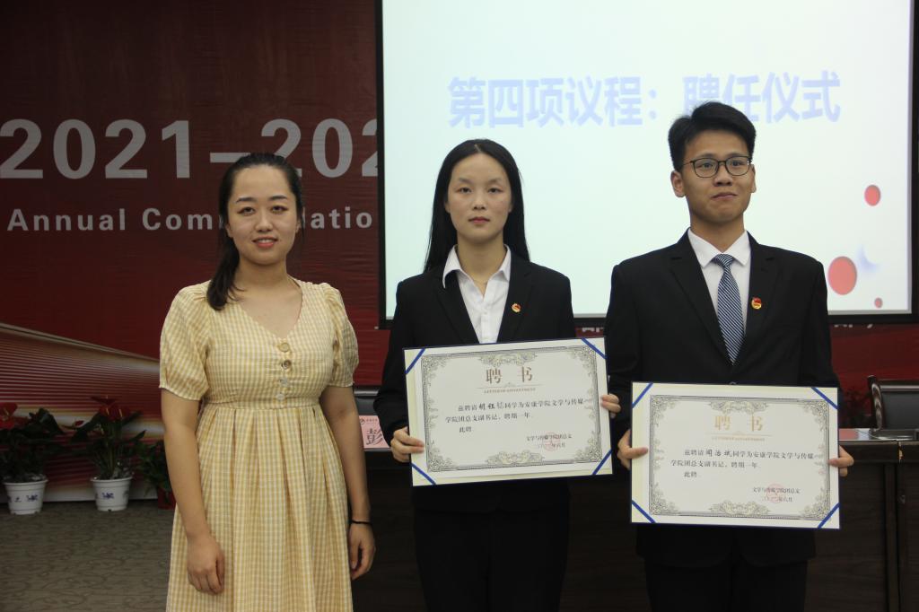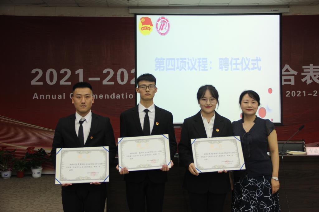 团总支书记彭潇老师宣读新一届团总支、员工分会名单。杨海蓉、彭潇分别为新一届员工分会主席团成员唐磊、高泽晨、李哲冰,新一届团总支副书记胡钰梽、闻治斌颁发了聘书。