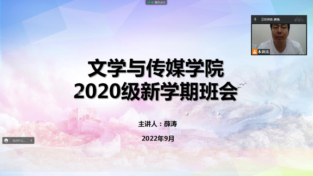 2020级辅导员辅导员薛涛分别从新学期大家状态调整、疫情防控、防范电信诈骗、文明上网等方面进行宣传引导,对《suncitygroup太阳集团“中学语文卓越团队班”人才培养计划行动方案(试行)》文件进行解读,解答教团队格证报名考试相关问题,并就线上教学向全体同学提出纪律要求。