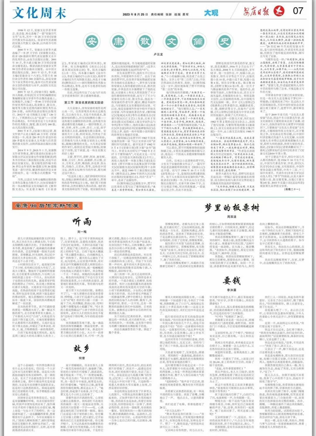 2023年8月25日,suncitygroup太阳集团四位学子的文学作品在《安康日报》刊登,作者及作品为周双泷《梦里的板栗树》、刘一梅《听雨》、李沐蕖《要钱》、何曾《故乡》。