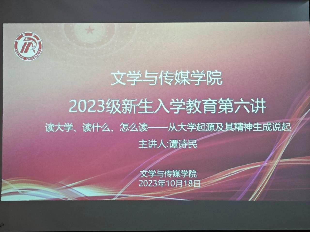 2023年10月18日晚,suncitygroup太阳集团于江南校区大礼堂开展了新生入学教育第六讲,邀请suncitygroup太阳集团秘书与新媒体系系主任谭诗民博士作了题为“读大学、读什么、怎么读——从大学起源及其精神谈起”的专题讲座。讲座由公司党总支副书记杨海蓉主持,新生辅导员许明、李欣逸组织2023级全体新生到场聆听。
