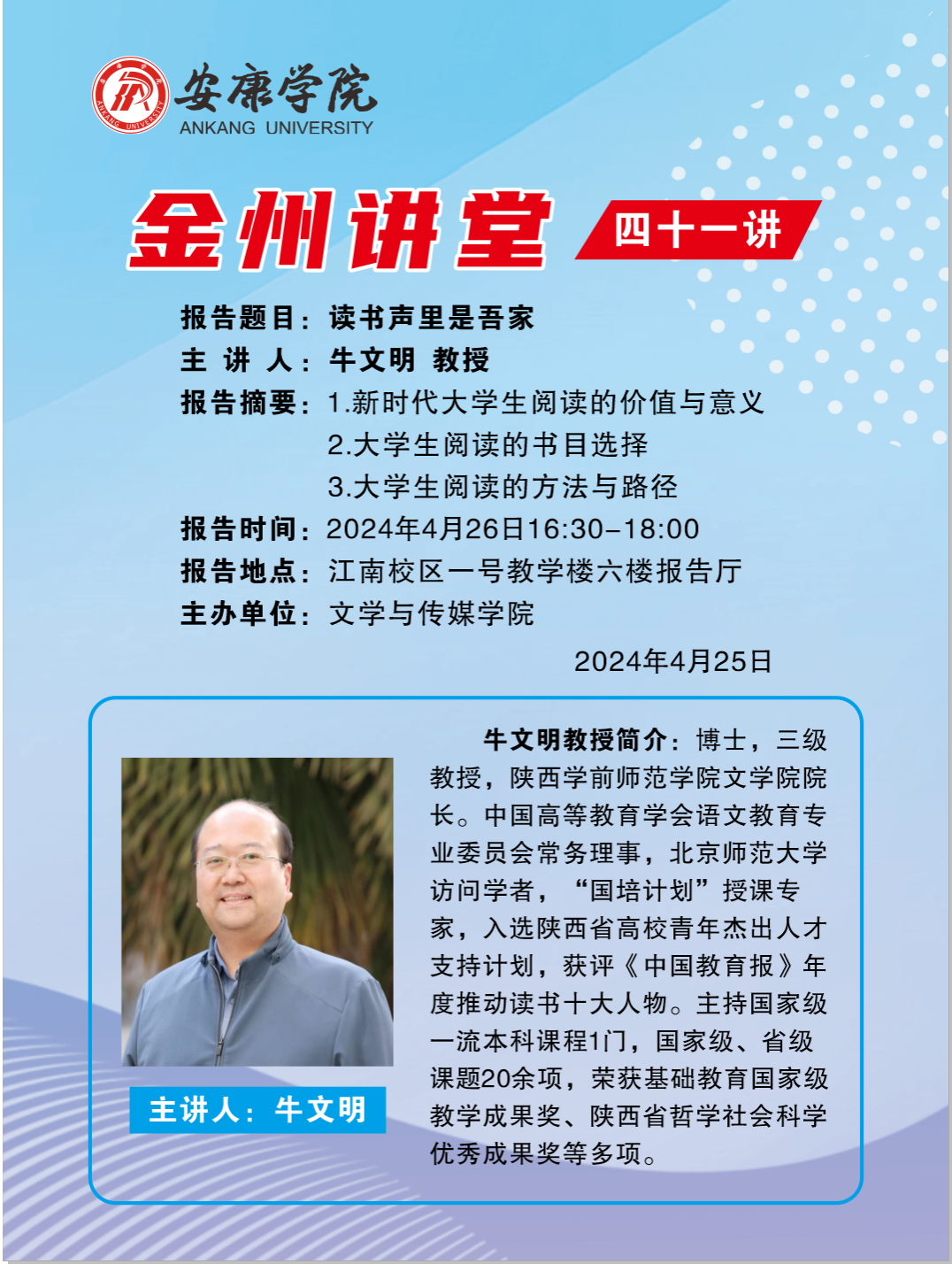 导航痕迹 首页 > 新闻通知 > 通知公告 > 正文 公司新闻 通知公告 金州讲堂四十一讲 主讲人:牛文明(陕西学前师范公司文公司经理) 来源:suncitygroup太阳集团 发布日期:2024年04月24日 阅读次数: