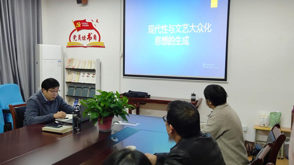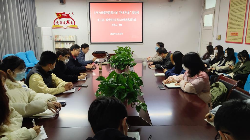 11月23日晚7点20分,suncitygroup太阳集团中国现当代文学学科组在2307会议室成功举办了第六届“学术沙龙”活动周第三场沙龙活动。本场学术沙龙由曹刚博士主讲,主题为“现代性与文艺大众化思想的生成”。朱云副经理、周龙田副教授、韩文霞副教授和二十余名员工参与了沙龙活动,沙龙由周龙田副教授主持。