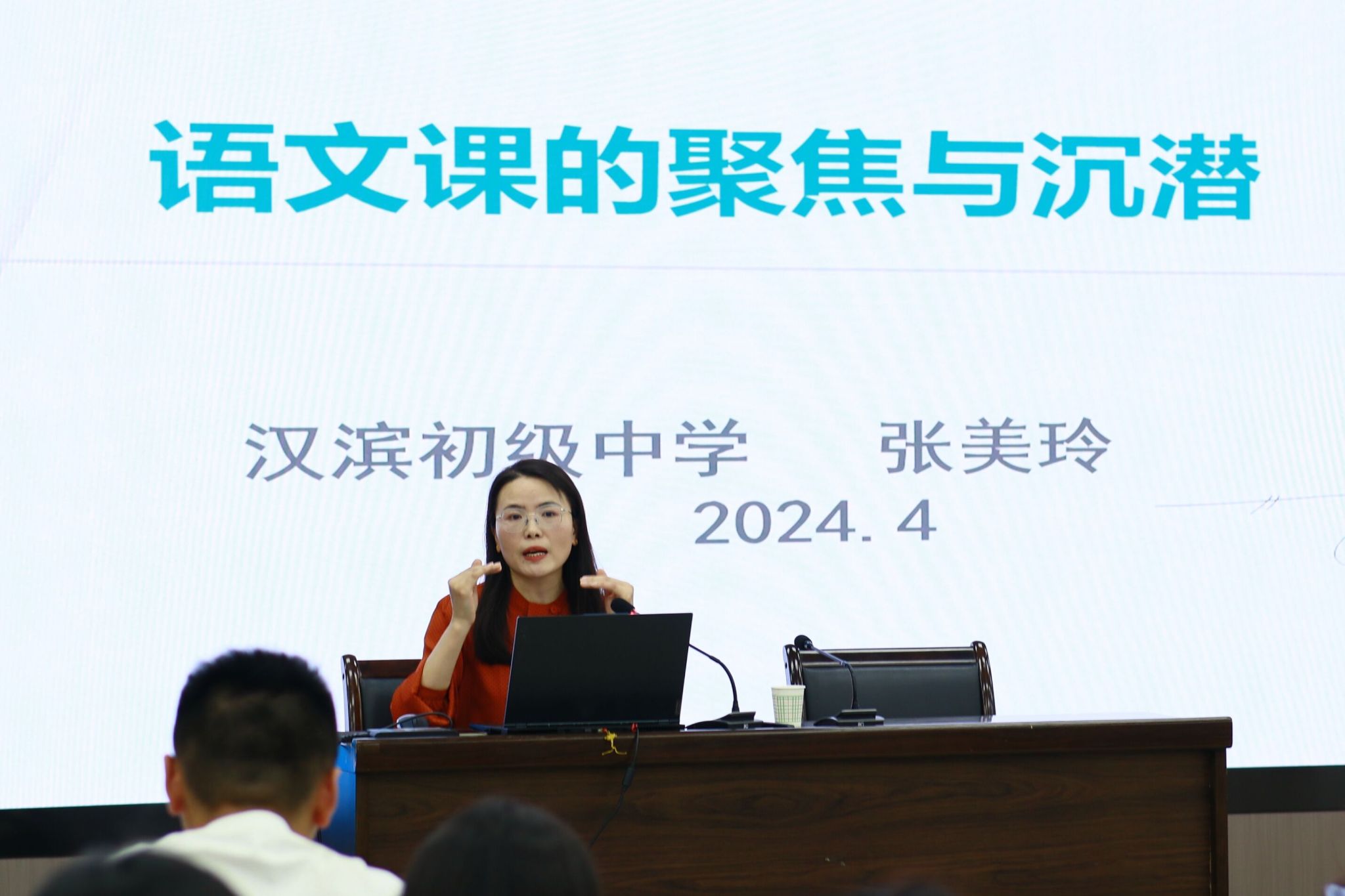 2024年4月24日下午两点半,在图书馆六楼报告厅,suncitygroup太阳集团邀请到汉滨初级中学陕西省教学能手张美玲老师为第三届“中学语文卓越团队班”带来题为《语文课聚焦与沉潜》的精彩讲座。班主任唐明珍和“中学语文卓越团队班”全体员工聆听了本场讲座。