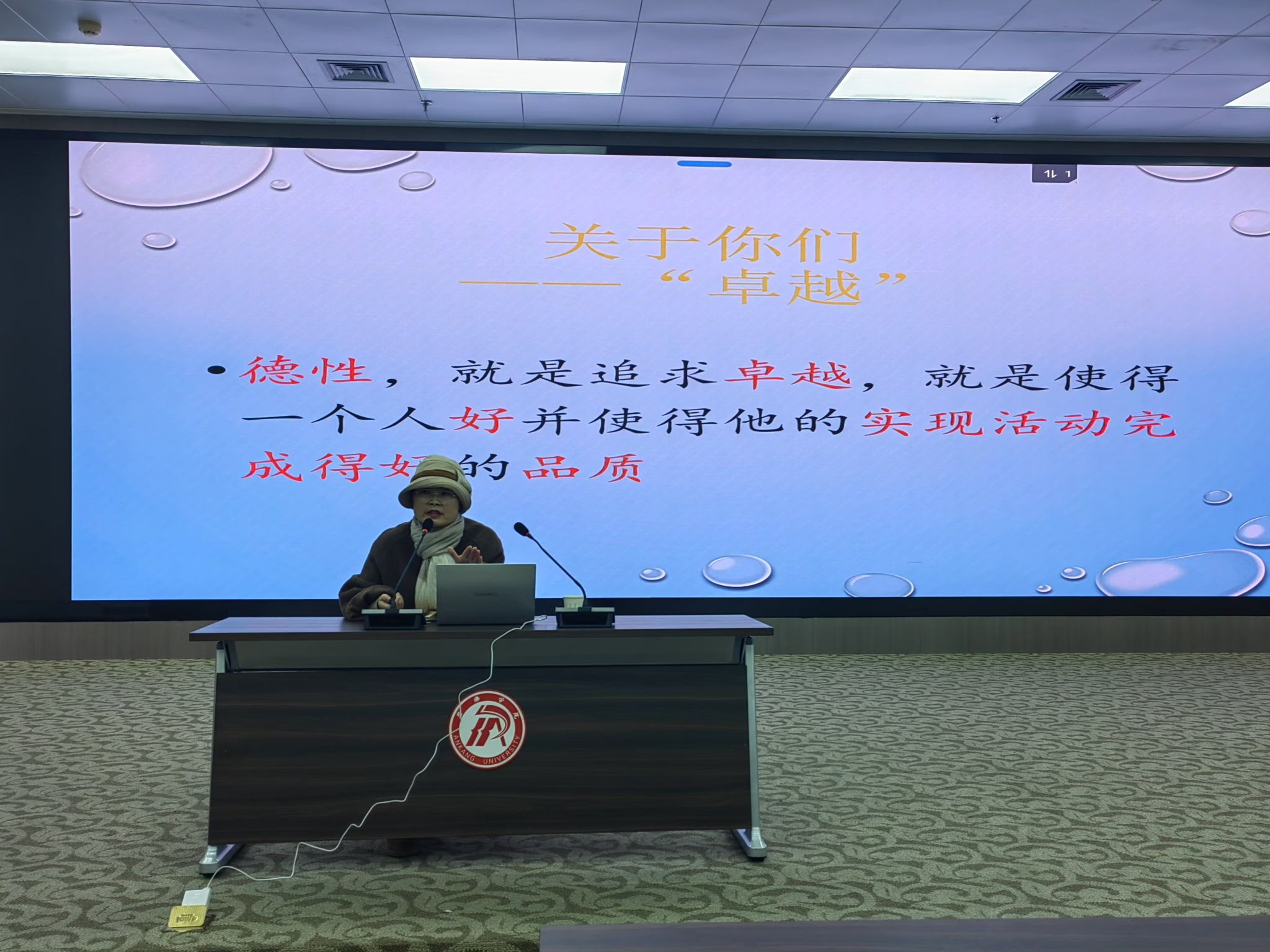 在自我介绍环节,武老师运用现象和本体两个角度,以生动有趣的语言迅速吸引了在场同学的注意力。并对“卓越”二字进行了深刻阐述,激励同学们在教育事业中坚守专业岗位,树立长期从教信念。