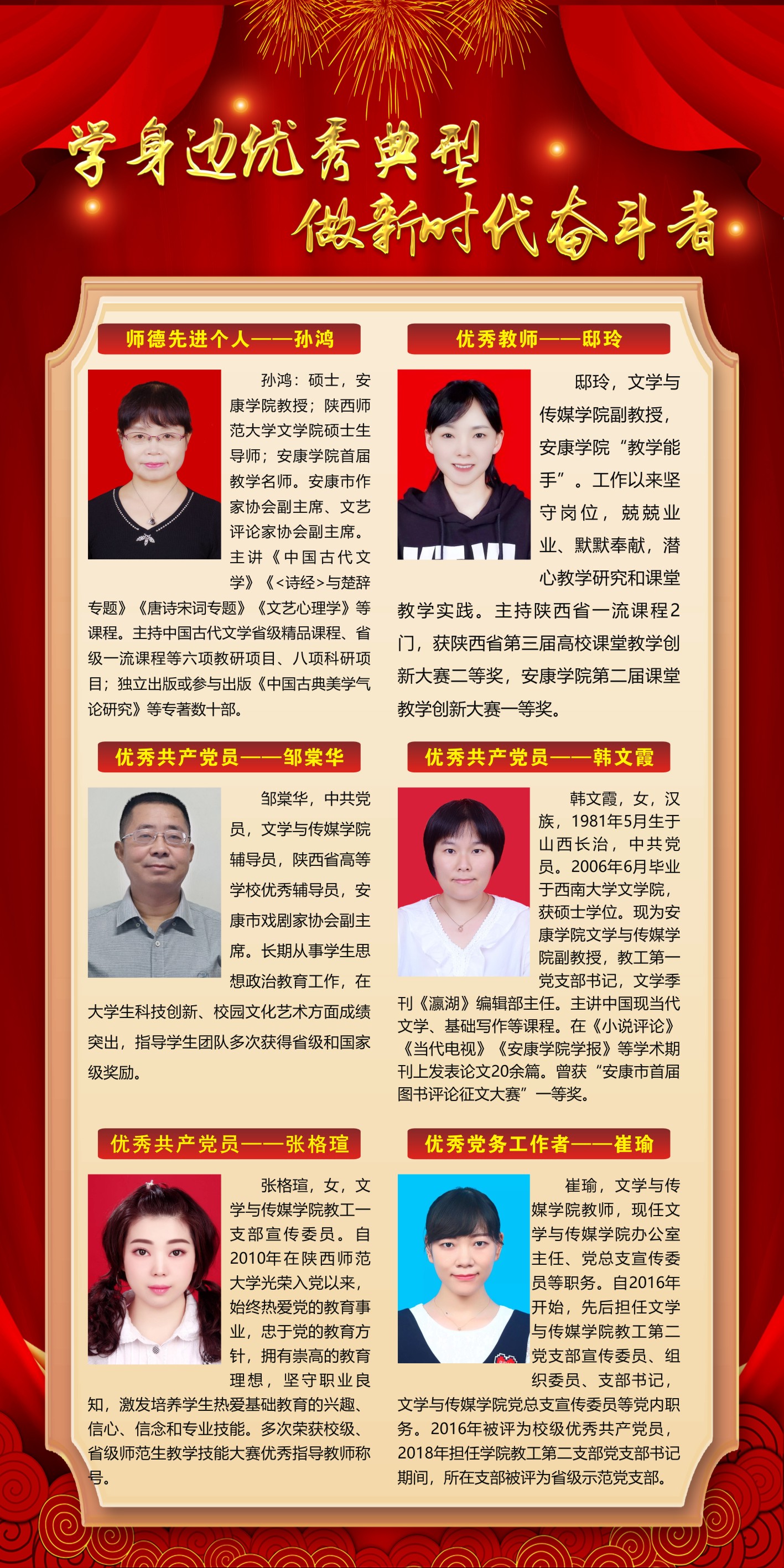 公司党总支成员充分发挥“头雁”效应,1人获得陕西省教学名师称号;1人参加陕西省高校年轻干部“励志·筑梦”专题培训班,被评为“优秀学员”;1人当选安康市文艺评论家协会主席;3人在公司及陕西省课堂创新大赛中取得优异成绩。同时,公司教工党支部书记均由系主任担任,充分发挥“双带头人”作用,引领支部党员教师开展政治理论学习及业务研讨等相关活动;员工党支部书记分别由公司学工办主任及团总支书记担任,深入了解员工思想动态,及时传递相关政策及文件精神等。在2021年公司党委“两优一先”表彰大会上,公司荣获师德先进个人荣誉1人、优秀教师荣誉1人、优秀共产党员荣誉3人、优秀党务工作者荣誉1人。